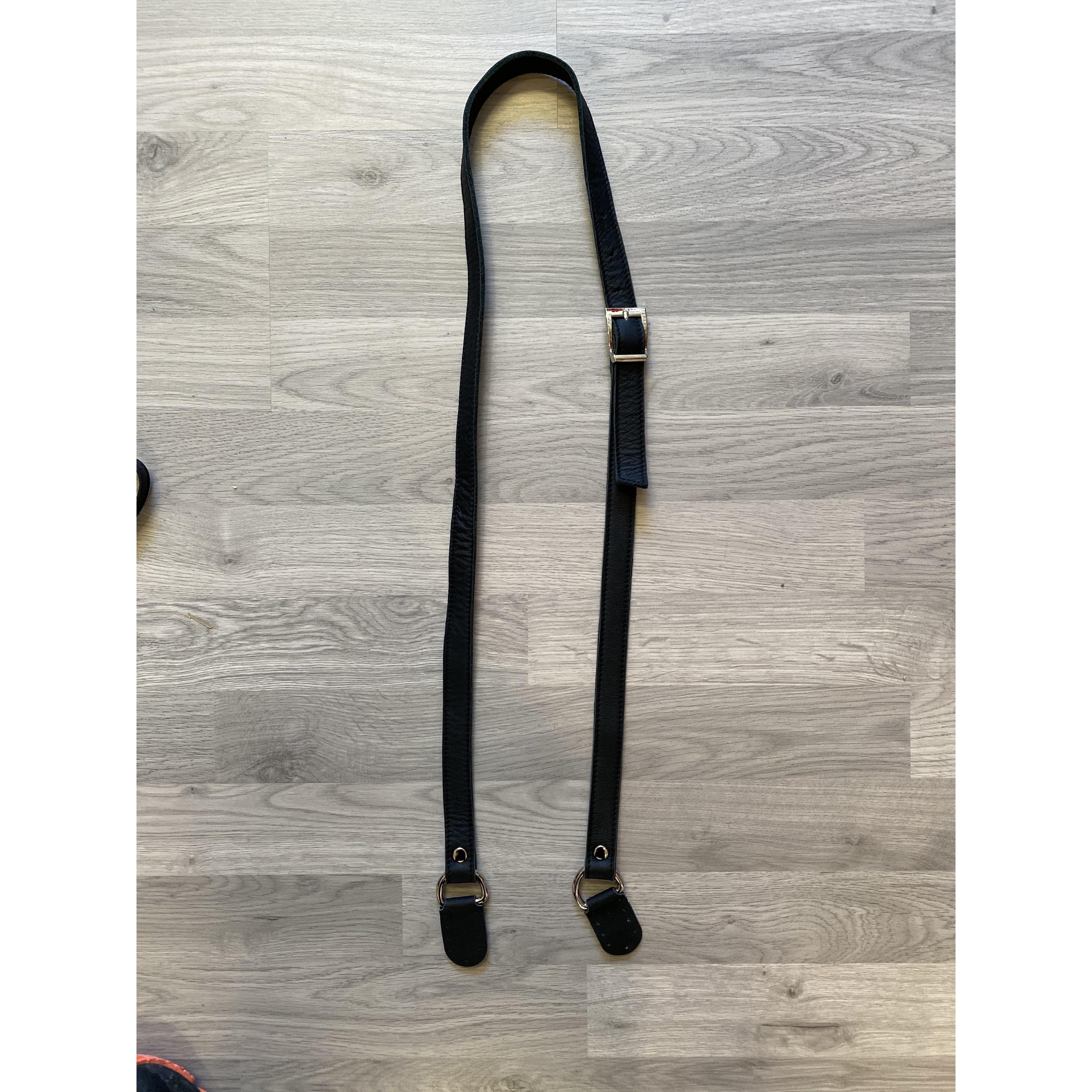 Skinnhank nr. 8. Lengste totallengde, ca 130 cm. Bredde 2 cm. Reima har beltespenne midt på for justering av lengde. Endene har gjennomhullet skinn for enkel montering på veska. Ytre diameter på ringen er 3,5 cm