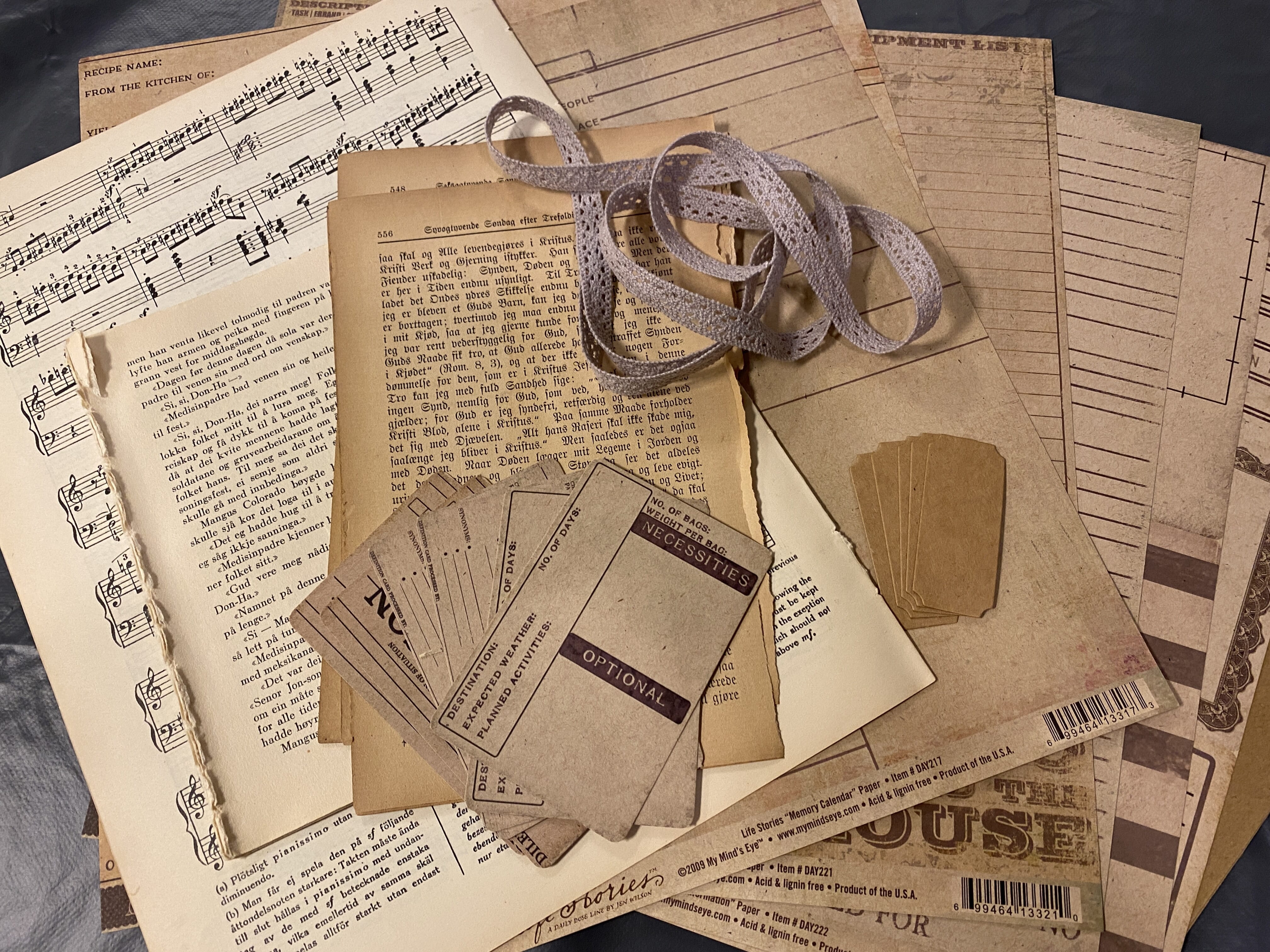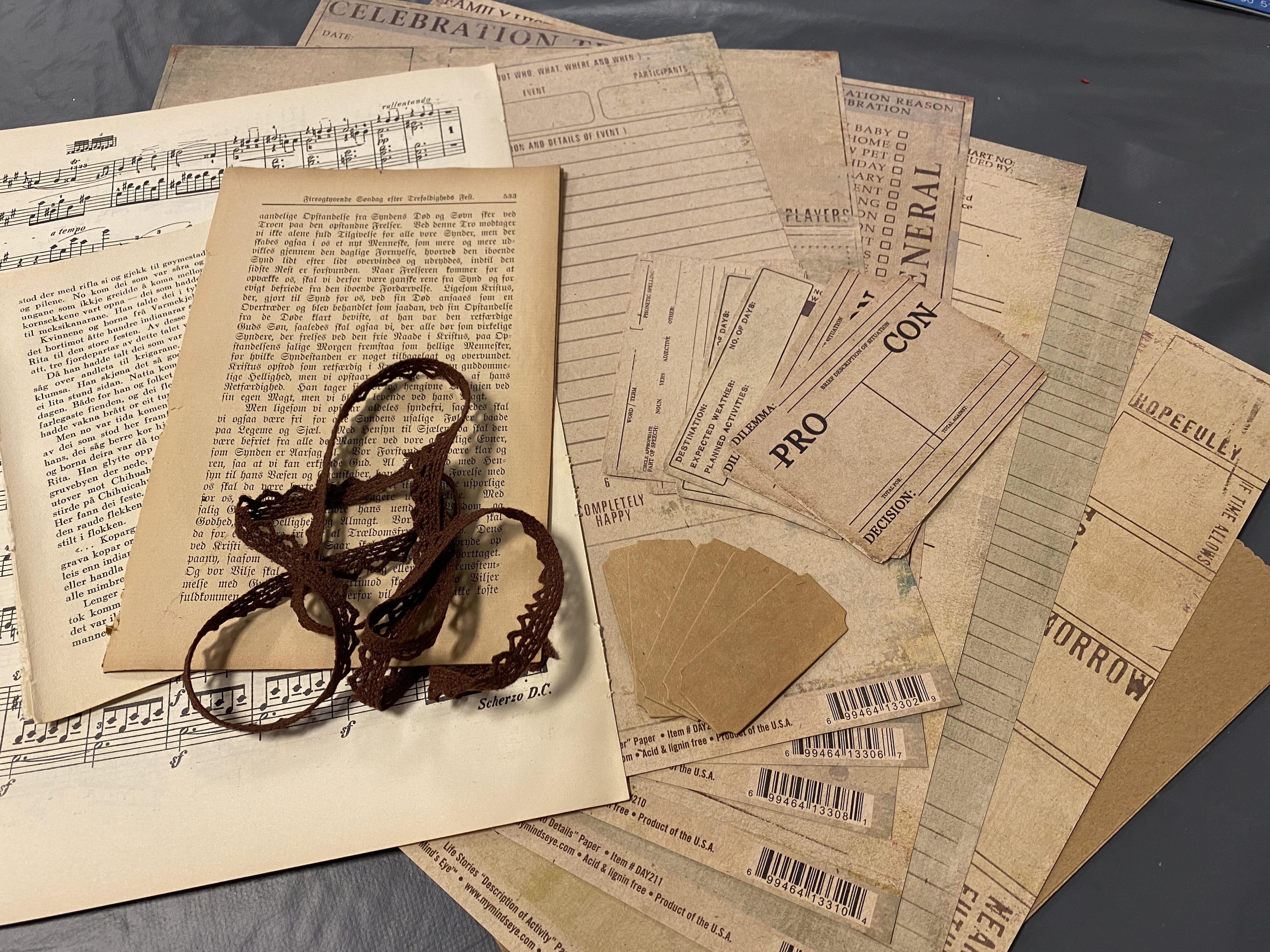 KIT001 inneholder mønsterark og journalingkort fra My Mind's Eye, bånd og diecuts fra Storyteller, antikke boksider, både noter og to ulike typer tekst.