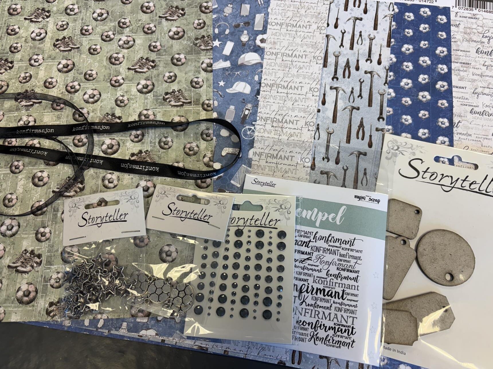 2 pakker Storyteller charms, Storyteller stempel, Storyteller bling, Storyteller chipboard og 2 meter Storyteller bånd.